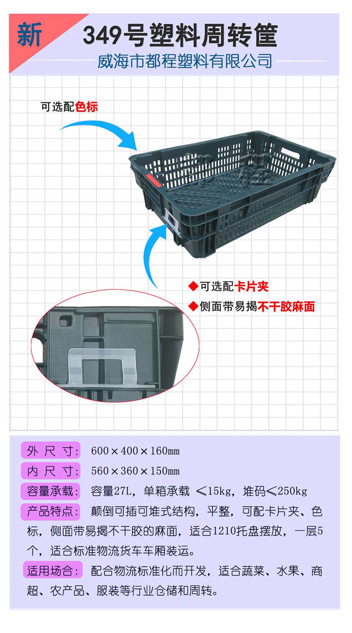較早從事塑料托盤、塑料周轉箱生產,主導產品有塑料托盤、塑料周轉(zhuǎn)箱|筐、各種型(xíng)號塑(sù)料筐、各種塑料盒|零件盒、ABS深水網浮等,產(chǎn)品品種有300多種,能夠滿足各(gè)行業貨物的倉儲和運輸(shū)的需要。